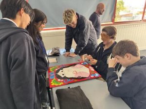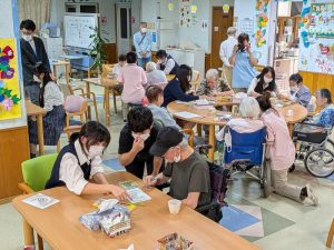 福祉施設訪問、松戸市の塗り絵を制作し、利用者の方と交流。ふれあい祭りでは塗り絵コーナーを出店(2年美術選択者)