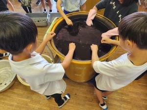 前年度から栽培された藍から作った「すくも」(藍を乾燥させ発酵させたもの)で,5年生が藍建てをする。藍建ては,藍師さんをゲストティーチャーに招き,昔ながらの方法(すくもを練って,灰汁や全粒粉を入れる)で行った。10日ほどで藍染めができるようになる。各学年の藍染めは,5年生が建てた藍を使う。
