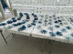 染めた作品は夏季休業中に町役場や地域の商業施設に展示する。6年生は町の施設と連携を図り藍の館で自分の卒業文集の表紙を染める。また,卒業式に向けて6年生は学校で染めた布を使って藍のコサージュを制作する。