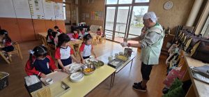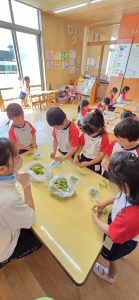 自園の畑で野菜の栽培・収穫を行い、その食物を使って行事食のクッキングを行った。自分達で育て、調理することで食材に対して興味・関心を深めたり、感謝の気持ちを持って食べるなどの姿が見られた。また、給食室と連携をとり、毎月食体験を行いピーマンの種取や、クッキーの型抜き、きのこほぐしなどを行い、子ども達が積極的に食に関わる機会を持つようにした。毎年秋には鮭を使って魚の解体を子ども達の目の前で行うことでさらに興味を持つことが出来た。5歳児は給食をバイキング形式で自身で配膳することで、食べれる量を調整し食べ残しを減らし完食する喜びを感じることが出来、苦手な物を食べてみようとする意欲にも繋がった。