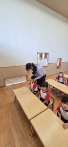 毎日「立腰」を行うことにより、心と体を整え、強い意志力や集中力、根気が身に付き、子ども達の生きていく土台を養っている。立腰と共に行っている「躾の三原則」では”挨拶は自分から先にしよう””返事はハイとはっきりしよう””履物は揃えイスを入れよう”についてもお便りや、参加型参観の中でお知らせし家庭と園で一緒に取り組んだ。