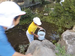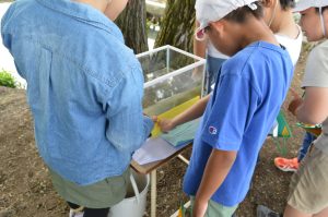 5年生の学級では、総合的な学習の時間に「日本列島の小川 プロジェクト」として、校内ビオトープを中心に環境について学習しました。はじめに、実際に「日本列島の小川」を散策し、水の流れや水辺の生き物、周囲の植生を観察しました。児童は、小川が多様な生き物のすみかとなっていることや、自然環境が人の手で守られていることに気付きました。