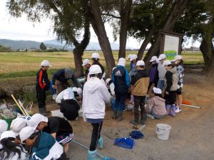この拾ヶ堰の環境を守るために実施している「拾ヶ堰クリーン大作戦」は、今年度で26回目を迎えました。児童会活動として環境ビオトープ委員会が中心となり、計画から運営までを行っています。学年ごとに清掃場所を分担し、ごみ拾いを中心とした清掃活動に取り組んでいます。活動開始当初は粗大ごみも多く見られましたが、長年の継続により、ごみの量は年々減少しています。地域の方々と共に行うこの活動は、地域に根付いた伝統行事として定着し、マスメディアに取り上げられることも多く、環境保全への意識を高める取組みとして今も続いています。
