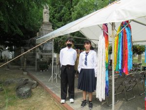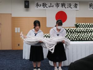 平和の分野では、7年生が、DVDで「和歌山大空襲」について学んだ。学習したことをワークシートにまとめ、自分たちが感じたことやこれからの世界平和について考えを深めた。今年度は大空襲から80年という節目の年ということもあり、和歌山市戦没者戦災死者合同追悼式と和歌山市戦災死者追悼法要に代表生徒が参列した。生徒は心を込めて千羽鶴を折り、これらの式典に千羽鶴をささげた。