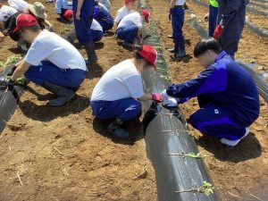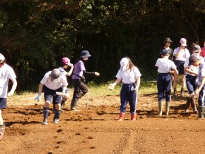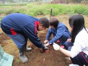 ・鹿田山での環境保全活動:地域社会の環境美化や奉仕の精神と自主・実践的な態度を育成するため、地元のNPO法人「鹿田山環境保全ネットワーク」と協働で、鹿田山フットパスのチップ敷きや綿花の栽培と収穫を行ったり、全校児童生徒で鹿田山の遊休農地の菜種まき活動に参加しました。小学部では「フォレストリースクール」として県職員を講師に、「触ってはいけない植物や動物」「昆虫の採り方と持ち方」などを詳しく教えていただきました。児童はとても興味深そうに話を聞き、熱心に質問をする姿も見られました。高等部では、大間々高校との「さつまいも苗植えと収穫」を通しての交流、「鹿田山環境保全ネットワーク」とフットパス整備作業に生徒とPTAも参加して作業を行いました。