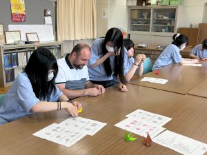 生活科学科で実施している日仏農業教育連携をきっかけに、フランスの高校との文化交流を行うことになりました。オンラインによる打合せを複数回行い、フラワーアレンジと生け花の違いなど、互いの文化を紹介しあいました。今年度は、6月にフランスの先生のみが本校を訪れ、折り紙やおにぎり作り、日本庭園の作庭の体験などを行っていただきました。生徒にとっても、英語によるコミュニケーションを通して言語活動の充実を図ることができたほか、国際的視野で自国の文化を再認識する良い機会となりました。来年度は生徒も連れて再び来校していただく予定です。