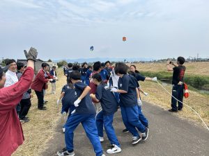 地域の凧組の皆様より来校していただき、白凧づくりや大凧の糸付け、あぶくれ、地がらめ体験を行った。加えて、各学年で手作りの凧を作り、凧合戦の会場で揚げた。また、今年はベトナム・ダナン市より国際交流として6名の生徒が来校し、ベトナムの伝統舞踊を学校で披露してもらった後に、大凧合戦会場にて3年生の地がらめ体験(1組・2組クラス対抗)を観戦した。互いの伝統芸能、伝統文化に触れることで刺激を受け、郷土への理解をより深めることができた。