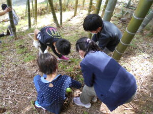 【タケノコ掘り】 【ビオトープでの活動】 【海外の小学校とのオンライン交流】