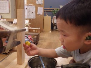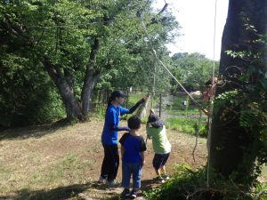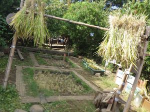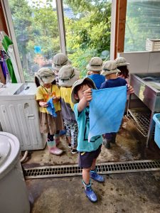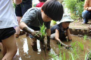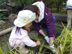 ①田んぼビオトープでは、園庭に設けた田んぼで二年目の米作りに挑戦した。土づくりから田植え、観察、稲刈り、脱穀、籾摺りまでを子ども主体で行い、生育の変化を記録し探究を深めた。鳥対策についても話し合い、前年との違いを考察するなど、出来事そのものを学びにしている。活動はドキュメンテーションにまとめ、園内外に共有している。