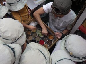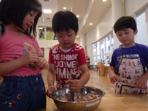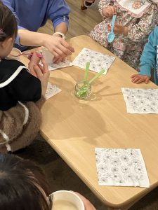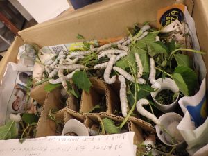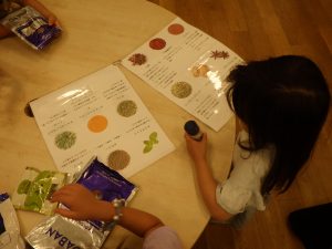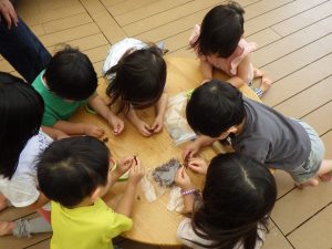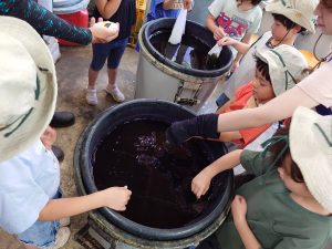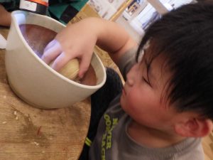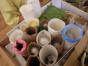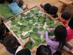 ②日本の伝統文化では、養蚕を継続し、種類が増えたことで繭の色の違いに気づく経験につながった。繭玉を紡いで糸を取り、植物を使った染めにも挑戦した。クラフト工房LaManoの見学では、藍染めや機織りを実際に見て学び、匂いや道具にも関心を寄せ、園に戻ってから再現しようとする姿が見られた。