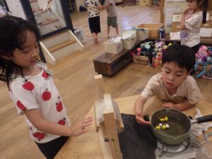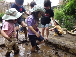 ④地域との連携では、冒険遊び場を毎月開催し、地域の方々が集う場として定着してきている。高校生との協働やおからワークショップも継続し、園が地域の一部として在り続けることを意識しながら、ゆるやかなつながりを育んでいる。