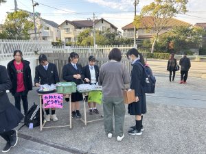 本校では、ユネスコスクールの活動を通じて、“届けよう、服のチカラ”プロジェクトの存在を知った。生徒会執行部が中心となる活動として取り組み、広報活動等も様々な方法で機運を高めることができるようになった。今年度も本校生・保護者の参加はもとより、学校前に設置した“届けよう、服のチカラ”プロジェクト協力依頼ボックス」には、地域の方々からたくさんのご協力をいただくことができた。年間を通して活動し、多くの段ボール箱に詰められた成果を、運営本部に届けることができた。