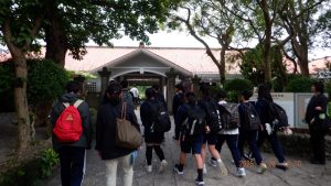 ・3年生では、沖縄修学旅行を実施し、命と平和を守る学習を行った。修学旅行前には、戦争が起こる原因や沖縄戦、ガマやひめゆり学徒隊について学んだ。平和祈念公園で行った平和集会では、平和宣言文を代表生徒が読み上げ、思いを込めて折った千羽鶴を奉納し、戦争で亡くなられた方々のご冥福と今後の世界に平和が続くことを祈った。