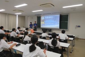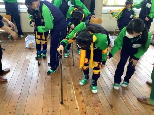 1学期は、まず、大牟田市を取り巻く高齢化の現状や共生社会をめざす大牟田市の取り組みについて事前学習を行った。その後、認知症を患っている当事者の方と、その支援をする方々に来校していただき、講話・班に分かれて自分たちができることについて話し合い、まとめ、考えを深めた。2学期は、高齢者擬似体験を行い、実際にどのような場面で不自由さや不便さを感じるのかを、体験から学び、今後の生活にどのように生かしていくかをまとめた。