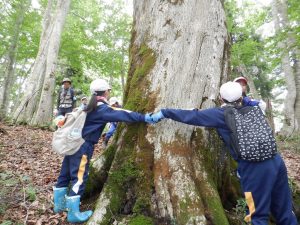 学校周辺の自然や林野庁の郷土の森に指定されている「恵みの森」、「癒しの森」などユネスコエコパーク只見が誇る雄大なブナの森を、美しい渓流を渡りながら観察・体験活動を実施。1・2年生が「恵みの森」、3・4年生が「癒しの森」へと継続的に足を運び、豊かな自然を学びの場としている。体験の中で五感を使って「ひと・もの・こと」と出合い、積極的に関わり合うことで、只見町の自然の豊かさやよさに改めて気付くとともに、森林の役割や雪との関係、自分たちの生活との関わりについて学びつつ、ふるさと只見への思いを深めることができている。また、「ただみ・ブナと川のミュージアム」を見学・体験し、只見の豊かな自然についての学びをさらに深めている。そして、これらの経験が、5・6年生段階の各教科等における学習内容だけでなく、豊かな自然に支えられた只見町の米づくりや、そこから派生する地場産業への目配せへと結び付き、学習のさらなる広がりや深まりにつなげることができている。