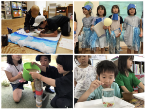 低学年では、水をじっくり観察することを出発点に学びを進めました。水を眺めてみたり、触ってみたり、かぶってみたりして、しずくを覗き込むと向こう側がさかさまに見えることや、コップのふちをこえてぷくっとふくらんでこぼれない不思議、上からかぶると傘が壊れてしまうほどの力があることなどを体を使って感じました。また、地球の中でどのように水が巡っているのか、大きな視点からも考えました。そのあとは「水のへんしんグループ」「旅する水グループ」「人と水グループ」に分かれ、それぞれのグループの興味関心から探究しました。発表では、水の分子になりきって劇で表現したり、山や川、海、空、生き物などをめぐる水を大きなマップで表現したり、泥水をろかする装置を手作りし実際にやってみるなどしました。