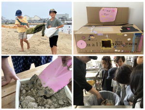 こどもりごみ問題対策本部を立ち上げ、みんなでごみについて考えました。ごみ処理施設の見学や、ビーチクリーン、ごみを減らす活動をしている方に話を聞くなどをしたあと、「まちごみちょうさたい」「ごみをへらしたい」「ごみってなんだ?たい」の3つのグループに分かれて学習を進めました。近隣のスーパーやレストラン、パン屋さんから出るごみについてインタビューをしに行ったり、学校周辺のごみ拾いをしてどんなごみが多いのかを知ったり、ポイ捨てを減らすためのチラシを作って呼びかけをしたり、捨てたくなるようなごみ箱を作ったり、プラスチックの歴史について調べ、捨てるはずのプラスチックでアップサイクルをしたり、土にかえりやすい素材、かえりにくい素材を実験で調べたりしました。最後には、ひとりひとりができる「わたしのせんげん」をし、ティッシュを1日5枚までにする、休みの日にはごみ拾いをする、スーパーで袋入りじゃない野菜を買う、など今の自分にできることは何かを考えました。