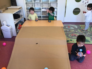 また、坂道と素材を組み合わせると「転がる」遊びだけではなくプチプチの下をくぐらせたりと見立て遊びや表現も楽しんでいる様子だった。坂道の種類によって遊びを変化させながら他児と共有しているのだと感じた。