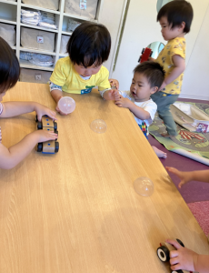 進級当初から、車や電車への興味から乗り物の玩具で遊ぶ児の姿が多く見 られていた。次第に保育室を走らせる遊びの中でテーブルの上で勢いをつけて床に落とす遊びを行う姿が増え「転がる」遊びへと発展した。
