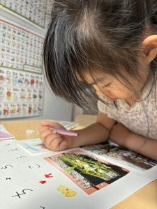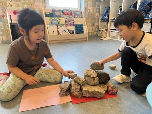 4歳児:石をテーマにした活動を行った。日頃あまり意識して出会うことのない石だが、一つとして同じ形のものはなく、それぞれに異なる魅力があることに子どもたちは気付いていった。生活の中で直接使用する機会はほとんどない存在である石も、遊びに取り入れることで、その役割や用途に目が向けられるようになり、「上に置いて物をおさえる役目がある」といった発見につながった。こうした気づきは、「この世に無意味なものはない」という考えへと広がり、一つひとつの物を大切にしようとする気持ちを育んでいった。さらに、出かけた公園で石の形や色の違いに目を向ける中で、石のマップを作り上げる姿も見られ、自分たちが暮らす環境や、そこに積み重なってきた時間や過去へと思いを馳せる経験へとつながっていった。