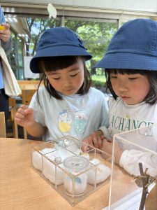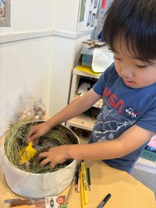 5歳児:園の屋上をより良い空間に変えていくプロジェクト活動に取り組んだ。園全体で使用する場所であることから、自分たちの思いだけでなく、通っている子どもや保護者や保育者、園を訪れる人の姿を想像しながら計画を立て取り組む姿が見られた。話し合いの中では、「お花の門を作りたい」「野菜がよく育つ場所にしたい」「鳥を呼びたい」といった思いが中心となった。特に鳥を呼ぶためには、生態を調べたり、生き物が住みやすい環境について考えたりする姿が見られた。その中で、「小さな声で遊んだほうが良い」「自分たちが育てた野菜を与える」といった意見が出され、生き物と共生していくためには自分たちの行動を変える必要があることにも気付いた。また、花や野菜についても、「夏の間はこまめに水やりをする」「野菜はいつ収穫するのか」「採れた野菜をどうするのか」など、子ども同士で多くの意見交換が行われた。作って終わりではなく、より良い状態を維持していくために何ができるのかを考える意識が育まれていった。さらに、屋上が本当により良い空間になっているかを何度も見直す姿も見られた。同じ目的をもってクラスで行動する中で、互いの良さに気付き、得意なことを生かし合い、苦手なところを補い合う関係性の深まりも感じられた。