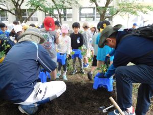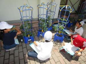 児童は、学習を通して野菜作りに取り組んだ。校区の緑のコーディネーターの皆さんに土づくり、世話の仕方を教えてもらい児童は意欲的に学習に取り組み、植物を育てることの大変さや育つ喜びを感じることで自然環境に感謝する気持ちを育むことができた。