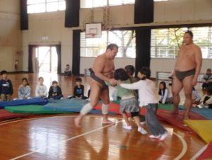 お相撲さんと相撲を取ったり質問をしたりして、交流した。児童は相撲を身近に感じ、触れることができた。児童は、楽しそうに相撲をとることができ大相撲への関心が授業を通して高まったことで、日本の伝統文化に対する意識が深まった。
