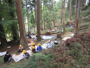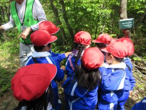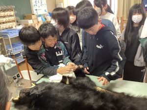 今年度も全校児童で、春に「山門水源の森」を訪れた。「山門水源の森を次の世代に引き継ぐ会」のメンバーの方に案内していただき、森の植物や生き物の観察、保全活動に取り組んだ。また、秋にはクマ出没の影響で現地へは行かず、学校での学習をした。「クマについて知ろう」をテーマに里山におけるクマとの共存などを考える機会となった。