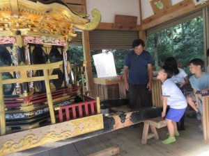 神社の神輿を見学した。地元の方に説明をしてもらい、文化財や地域の祭事をを大切に守る熱い思いにふれた。その中で児童は、ふるさとを誇らしく思い、自分たちも地域の文化財を大切に守っていきたいという意欲を高めた。