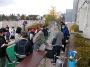 ① 地域の人と作ったさつまいもを、地域の人と防災調理へ