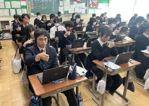 ・韓国ソウルの東国大学附属高校とオンライン交流を行った。「電子廃棄物の処理の現状、環境や人権に与える影響」について自国の現状を調査し発表し、持続可能な開発について考える貴重な機会とすることができた。