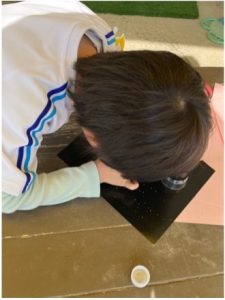 収穫したコキアから種を取った。とても小さい種だったので、もっとよく見たいということでミニルーペを出すとミニルーペで小さい種をよく見ていた。