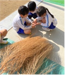赤くなっていたコキアの色が変わり、仮園舎から新園舎に引っ越しをするタイミングで収穫することにした。収穫すると箒に見えて、自然とテラスを掃く姿がみられた。