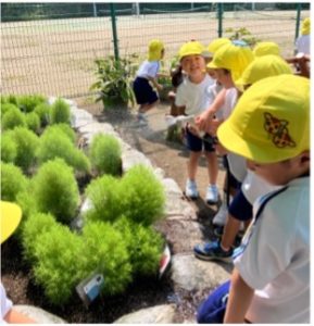 年度当初、昨年度の年長児が作ったコキアのほうきを保育室で使っていると、「僕も作ったよ!」「家で使ってる!」とクラスの友達に伝えたり、使ってみたりする姿が見られていた。その話を附属中学校にすると、「一緒に箒を作れたらいいね!」と苗をいただき、子どもたちと植えることにした。こども園は仮園舎で生活していたので、コキアを植えるための花壇作りから子どもと行った。農場の腐葉土を園庭に持ってきてもらい、その腐葉土を土嚢袋に詰めて、囲いを作って土を運んで花壇を作った。「コキアってふわふわなんだね!」「リスみたいでかわいい!」と大事そうに苗を花壇に植えた。夏休み中もなかよしタイム(預かり保育)の子どもたちと協力して水やりを頑張り、どんどん大きく成長していく姿を喜んでいた。