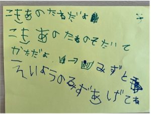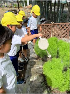 「もう小学校に行っちゃうから来年植えられないね。」「そら組さん(年中児)に育ててもらおう!」ということになり、届けに行った。「育て方を手紙に書こうよ!」と手紙を書いたり、喜んでもらえるようにかわいくリボンをつけたりラッピングしたりしていた。年中児クラスに届けにいくと、喜んでもらえて嬉しそうだった。育てた命を繋げていけるようにしたい。