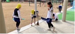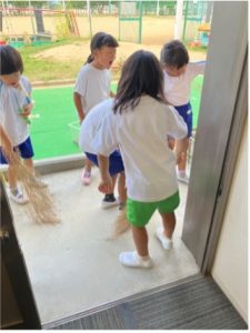 新園舎に引っ越してきて、広くなったテラスに落ち葉がたくさん落ちてきたので、箒を用意して、子どもたちと掃除をした。箒を使ったことがなかった子どもも多く、最初はぎこちない動きだったが、使っているうちに上手に箒を使えるようになってきて、昔からある箒という掃除道具の便利さを実感していた。