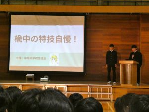 「平和の鐘を鳴らそうin上行寺」(7月)では、有志が運営ボランティアとして参加するとともに、生徒会や学年での取組を発表し、環境問題や平和について呼びかけた。こうした諸活動は「楡中SDGsパスポート」に記録し、振り返りを行い、ボランティア精神の向上につなげている。また、本校の目指す学校「『よさ』を見つけ、『よさ』を認め、『よさ』を伸ばし生かす学校」の実現のため、学習発表会では、生徒が自分のよさを発表する場を設定した。友達の新たな一面を知ることでよさを認め合うことができ、自己有用感や自己肯定感の高まりにつながった。