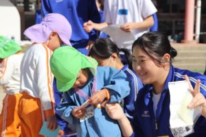 中学3年生と村内の園児や幼児が触れ合う活動を毎年行っている。この体験学習を通して自分自身がこれまで地域の多くの方々から大切に育てられてきたことを再認識することができた。