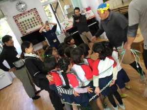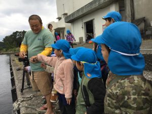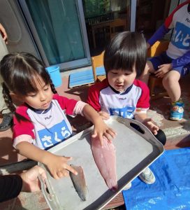 『泳いでいる魚が食卓に上がるまでのストーリーを知ろう、感じよう!』をテーマに、年長クラスが漁師さんやNPO法人うお泊の方々から話を聞き、実際に魚に触れたり、捌く様子を見たりして学びました。魚を獲ってくれる人・買い付けて捌いてくれる人・調理してくれる人がいて、自分たちが食べられる!という流れを教わり、魚を食べられることに感謝の思いを持てるようになりました。屋久島特産のトビウオになりきり、トビウオ漁の疑似体験を行ないました。漁の工夫や地域の文化を体感的に学ぶ機会となりました。