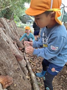 昨年度、年長児が栽培していた椎茸が、元気に育っていることを発見しました。子ども達から収穫したいという声が多く聞かれたことを受け、“しいたけ部”を立ち上げ、日常的に世話をした子が収穫できることにしました。子ども達は収穫を楽しみに、菌打ちや水やりなどの世話に意欲的に取り組み、心を込めて育てた椎茸を食べることで、おいしい・うれしいと感じ、苦手な子どもも食べられるようになりました。周りの人にふるまい、喜んでもらうことで達成感を共有し、食への意欲が高まりました。