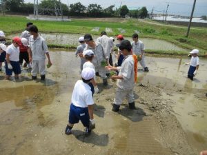 ①水田での環境教育と地域連携:米の生産を通して、水田の多面的な社会的価値を見出し、地域交流の場としての水田圃場を活用するため、近隣小学校との協働学習を行った。また、㈱サタケとも連携し、イネの収量・品質調査を行った。(環境科学科)