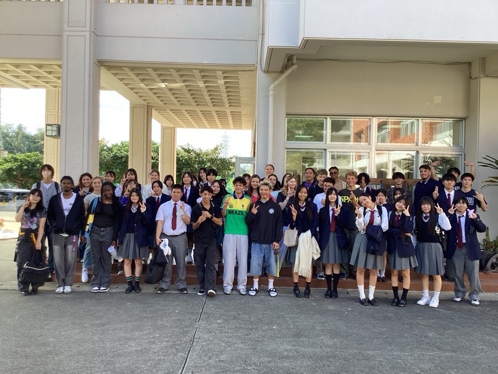⑤国際理解のため、本校では嘉手納基地内のカデナハイスクールと積極的な交流を行っている。お互いの授業への参加や部活動での交流など、基地との共存について考える機会になればと考えている。また、本年度は日韓文化交流基金主催による韓国研修に12名の生徒が参加した。2月には韓国の生徒を受け入れる予定である。他国の方々に接することで異文化を理解したり、海外へ目を向けるきっかけとなっている。