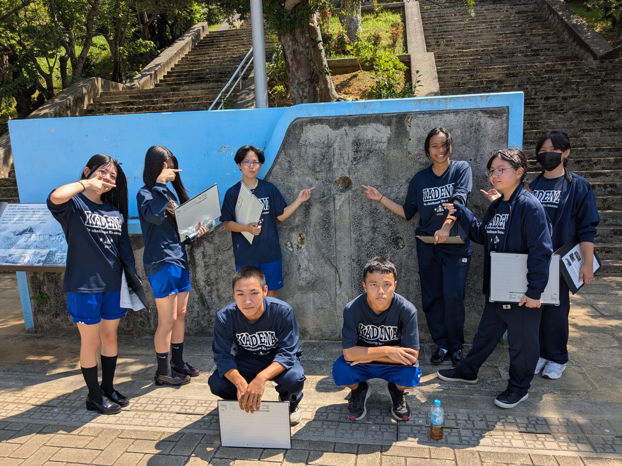 ①人文地域系列では沖縄戦から平和について学ぶために戦跡を巡る授業を行っている。本校に隣接する嘉手納基地 がなぜできたのから、これから 私たちは平和を維持し、二度と戦争をしないために何をすればいいのかを考えた。