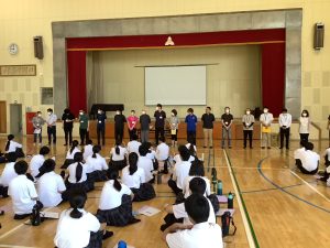 本校では、実社会や実生活との関わりを重視した「生き方」に焦点をあて、キャリア教育を軸とした取組を行っており、各学年の発達段階に応じた体験活動を展開し、生徒に主体性や創造性を身につけさせることをテーマとしている。身につけたい力として、将来にわたって持続可能な発展に向けての知識や価値観をもち行動できる力、情報収集能力や分析能力、コミュニケーション能力の育成を目指すこととしている。具体的な活動として、①福祉 ②生産と消費 ③地域と将来を見つめる活動を行った。