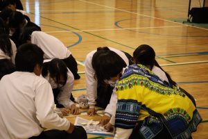食育として(株)明治よりGTを迎え、身近な食べ物である「チョコレート」から世界の様子や国際協力について考えた。カカオの生産国の現状や課題を知り、私たちにできることは何かをグループワークをしながら考えていった。また近隣高校共催の「届けよう、服のチカラプロジェクト」に参加し、服の循環への貢献だけでなく子ども服を必要とする海外の子どもたちへの喜びに繋がる活動を実感することができた。