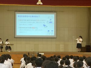 2年生では、昨年度の大牟田市内の「企業訪問」の経験を生かして、実践的な職場体験を行った。実際に職業人の方々から教わりながら体験できたことが新鮮で楽しむことができた一方、働くことの大変さや人との関わることの大切さなどを学び、自分の将来の夢を考えるきっかけとなった。