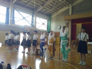 ①地域の伝統文化に関わる活動として、6月に「伝統芸能発表会」を行った。地域に伝わる太鼓や踊りなどを地域の方や保護者の方に向けて発表した。練習には、ゲストティーチャーとして地域の方に来ていただき、本物の伝統に触れる機会を得ることができた。この会を通して、子どもたちは大野町への愛情や地域の方との関わり、地域の方の温かさに触れることができた。より一層大野町を好きになる行事となった。