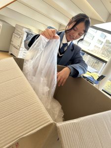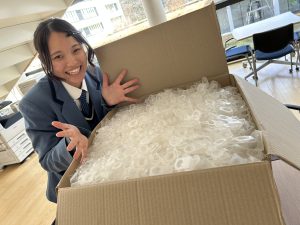 本校ユネスコ委員会の活動目標は「小さなことから社会貢献」です。コンタクトレンズは日常で使用していて、回収もしやすいことから、昨年度から活動を始めました。委員会で作ったコンタクトレンズの空ケースボックスや、定期的に委員会で集まって、各クラスから回収しました。4月から1月中旬までで、約16㎏のコンタクトレンズの空ケースを日本アイバンク協会へ寄付することができました。