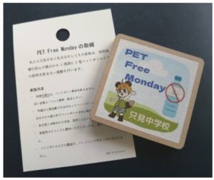 プラスチックゴミを減らそうという趣旨で、毎週月曜日はペットボトル飲料を飲まないよう飲むことを控えようと呼びかける「PET Free Monday」を4年前から実践している。金曜日の校内放送で月曜日の「PET Free Monday」のことと、土日のペットボトル飲料の購入を控えめにしてもらうことを呼びかけている。今後も継続していき学校・家庭・地域全体でブラスチックゴミの削減につなげていきたい。