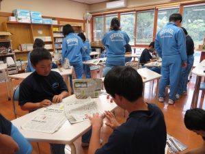 本校では、海洋の視点を取り入れたESDに力を入れて取り組んでいる。上流に住む私たちからプラゴミを減らす活動としての新聞バッグ作りを継続して行っている。レジ袋有料化に伴って本校の新聞紙レジ袋がたくさんのメディアに取り上げていただき、子どもたちの考えが町の人たちのみならず、県内外から注目されるようになった。地域の方に支えられながら、新聞紙レジ袋の生産活動の灯を絶やすことなく取り組んでいる。今後も持続可能な活動・伝統として引き継いでいくため、今年度はAct locallyにもう一度、目を受けて地域に根差した活動に取り組み、SDGs委員会を中心とした伝達講習会を行った。外部への発信により、大変ありがたいことに地域内外から本校の新聞紙バッグを紹介したい・使用したいというご連絡を現在もいただいており、子どもたちは自分たちの活動に大きな誇りと責任をもって取り組むことができている。